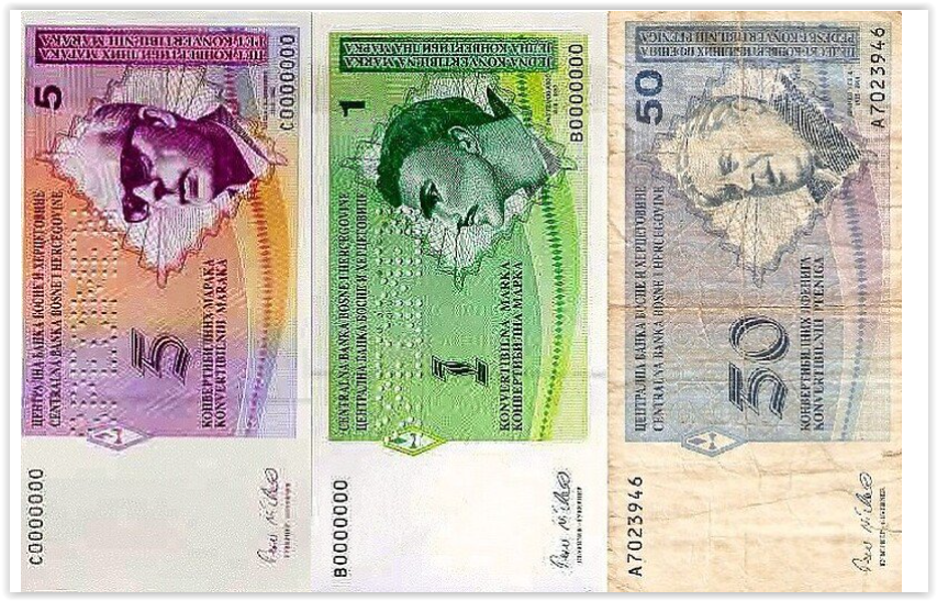 Na novčanici od 0,50 KM za FBiH istaknut je Skender Kulenović, a na izdanju za RS Branko Ćopić. Na novčanici od 1 KM za FBiH bio je Fra Ivan Frane Jukić, i ovo je češće viđena novčanica od izdanja koje je štampano za RS – na kojoj je bio nobelovac Ivo Andrić, koji je danas na novčanici od 200 KM. Na novčanici od 5 KM bio je Meša Selimović.