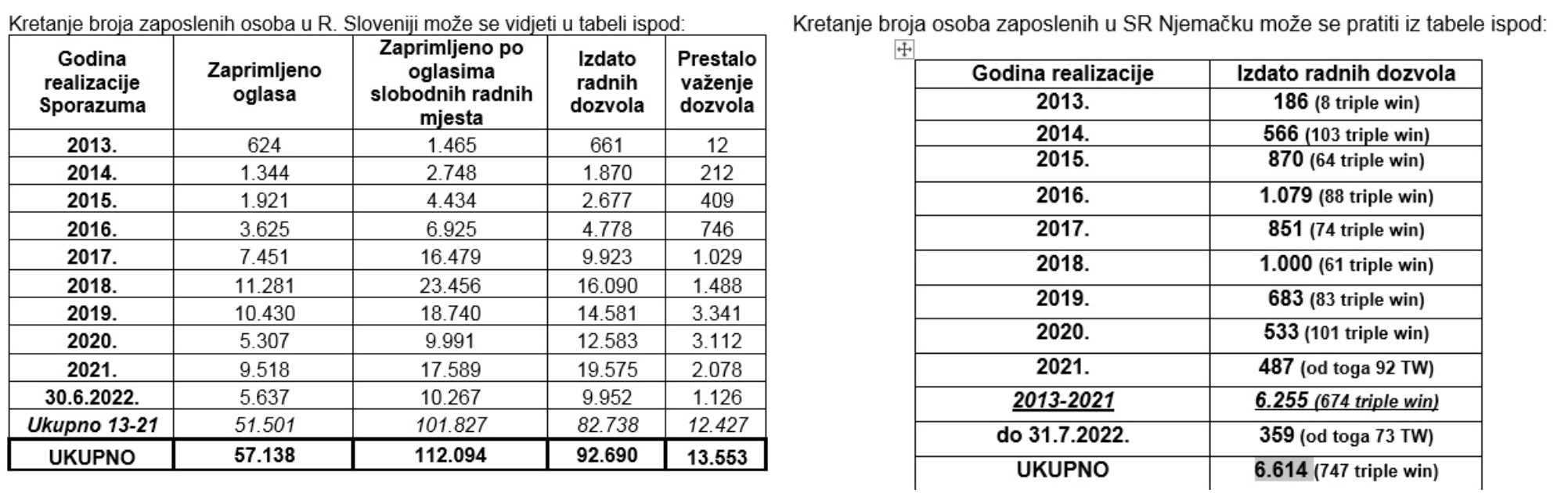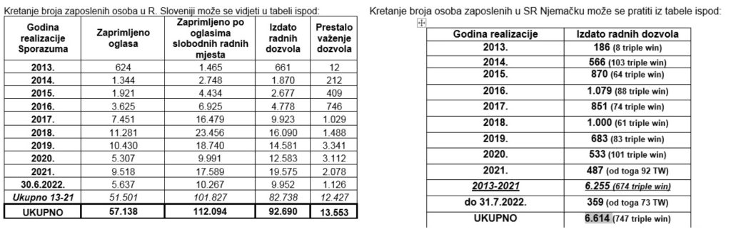 Od 2013. do kraja juna ove godine za rad u Sloveniji izdato je ukupno 92.690 radnih dozvola našim građanima, dok je za rad u Njemačkoj tokom istog perioda izdato ukupno 6.614 posredstvom Agencije.