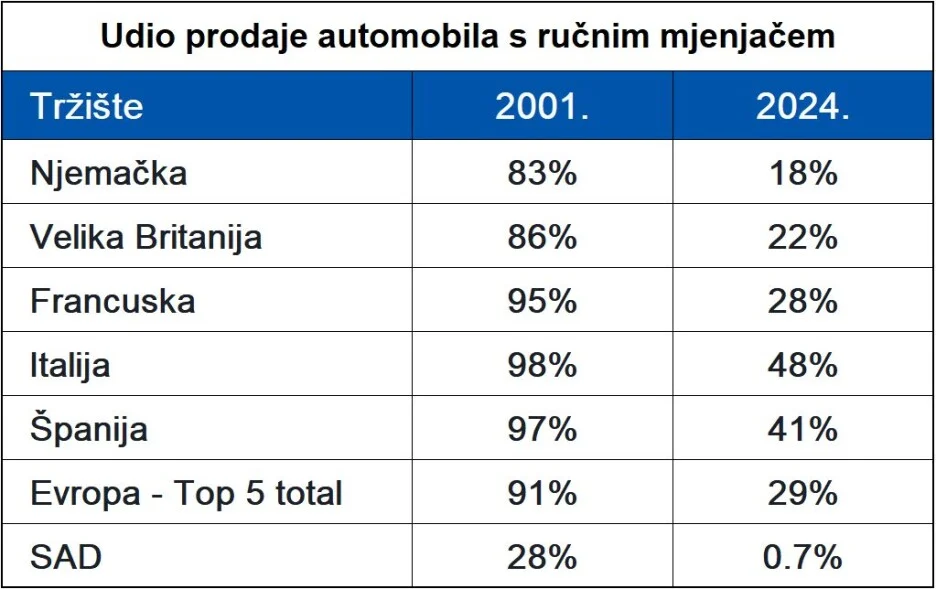 Ovom temom smo se bavili u više navrata, ali kako bismo razumjeli trenutne trendove, analizirajući brojke na glavnim evropskim tržištima i posebno Sjedinjenim Američkim Državama, očigledno je da ručni mjenjač postaje prošlost.