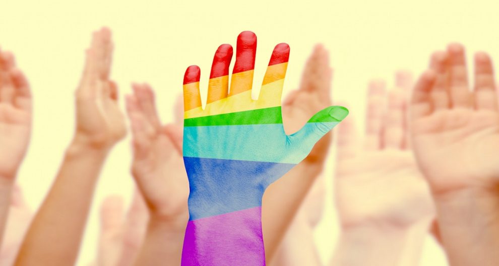 Man's hands painted as the rainbow flag on other hands background isolated on white