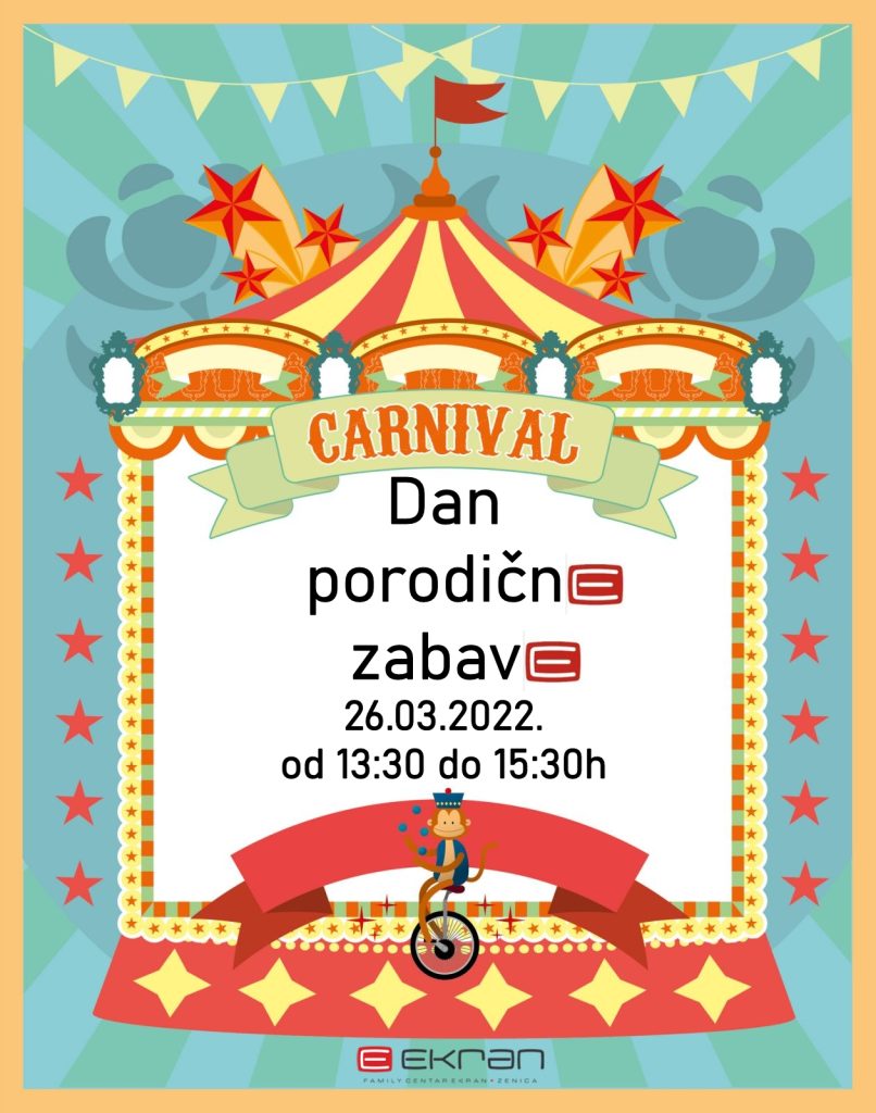 Dragi roditelji, djevojčice i dječaci, pozvani ste na najbolje duženje i zabavu, DAN PORODIČNE ZABAVE u Family centru Ekran. Provedite subotnje poslijepodne kod nas, naručite naš HAPPY MENU po promotivnoj cijeni, i zabavite se uz karnevalske igre u prostoru naše rođendanonice.