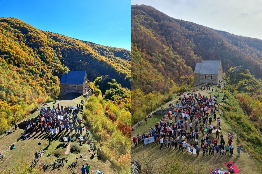 Fotografija lijevo: Kada se koliko-toliko korona “stišala”, 2021. godine organizujemo turu sa jednim minibusem i privatnim vozilima, u čijoj koloni je bilo 110 planinara, sa povodom obilježavanja godišnjice krunisanja Tvrtka I za prvog kralja Bosne. Dodao sam i Kraljevu Sutjesku, pa je tura dobila i edukativni karakter.