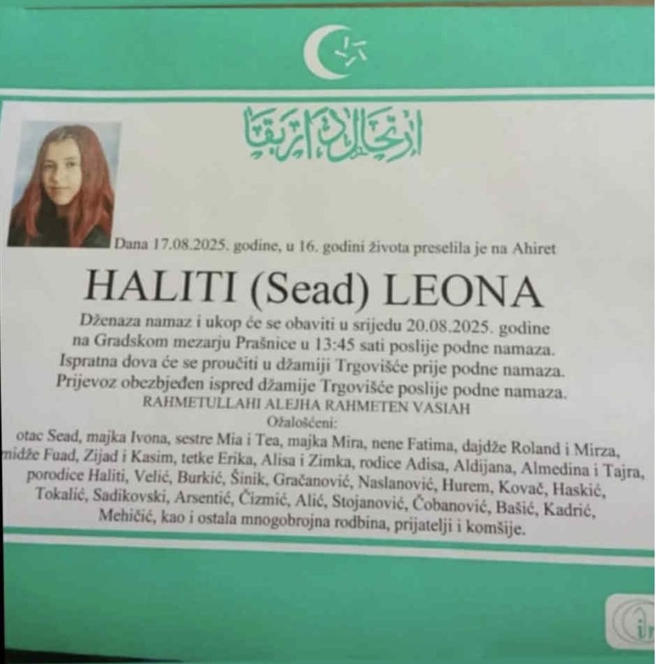 Dženaza namaz tragično preminuloj šesnaestogodišnjoj Leoni Haliti iz Zenice klanjati će se danas klanjat će se danas, poslije podne namaza, u 13:45 sati na Gradskom mezarju Prašnice.