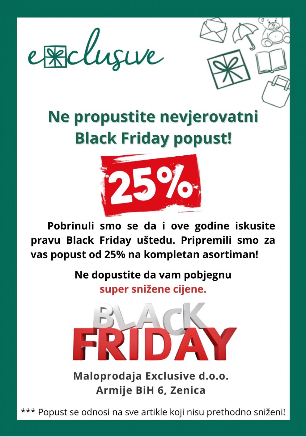 Samo u petak 27.11. u maloprodajnom objektu Exclusive doo  popust za sve kupce u iznosu od 25% na svu robu koja nije na sniženju.