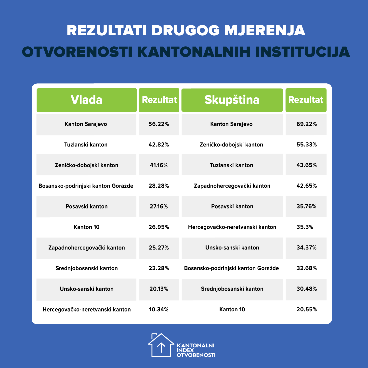 Međutim, nakon što je prvo istraživanje otvorenosti kantonalnih vlada i skupština provedeno početkom ove godine, institucije su pozvane da unaprijede svoje rezultate. Na ovaj poziv odazvala se polovina institucija, međutim, iako su deklarativno pristali da unaprijede svoj rezultat, samo dio njih napravio je stvarni pomak.