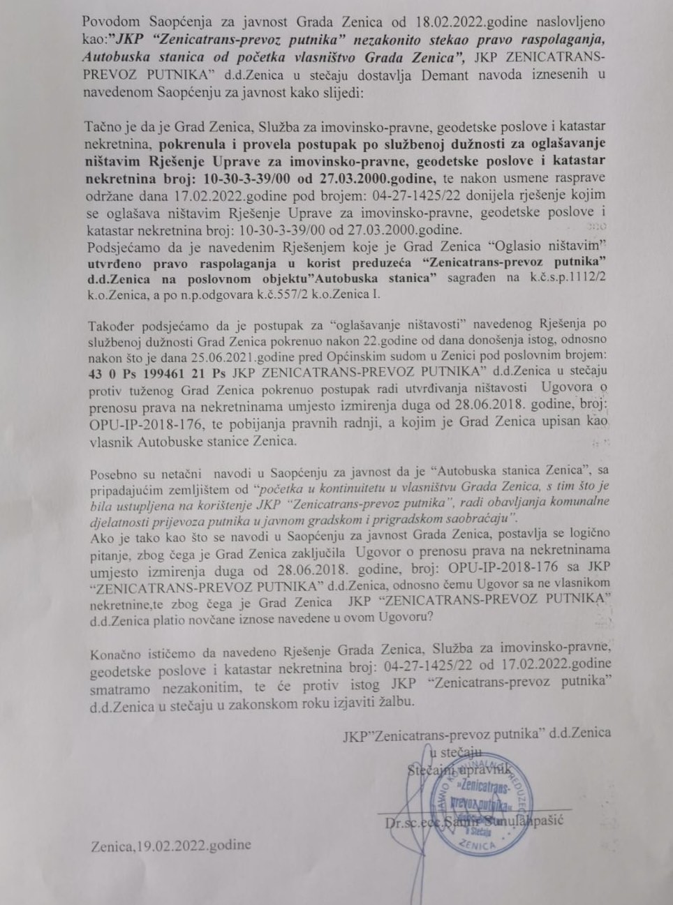 Povodom Saopćenja za javnost Grada Zenica od 18.02.2022. godine naslovljeno kao: ”JKP “Zenicatrans-prevoz putnika” nezakonito stekao pravo raspolaganja, Autobuska stanica od početka vlasništvo Grada Zenica”, JKP ZENICATRANS-PREVOZ PUTNIKA” d.d.Zenica u stečaju dostavlja Demant navoda iznesenih u navedenom Saopćenju za javnost kako slijedi: