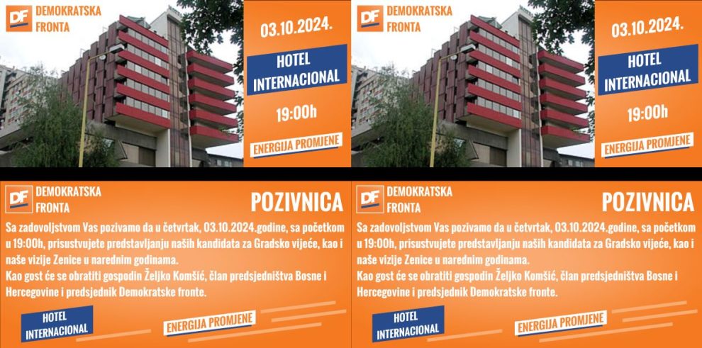 Sa zadovoljstvom vas pozivamo da u četvrtak, 03.10.2024.godine, sa početkom u 19:00h, u Hotelu Internacional, prisustvujete predstavljanju naših kandidata za Gradsko vijeće, kao i naše vizije Zenice u narednim godinama.