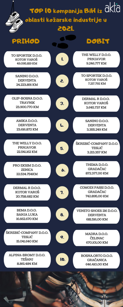 Akta.ba je napravila analizu po ostvarenoj dobiti i prihodima u 2021. kada je u pitanju kožarska industrija u Bosni i Hercegovini.