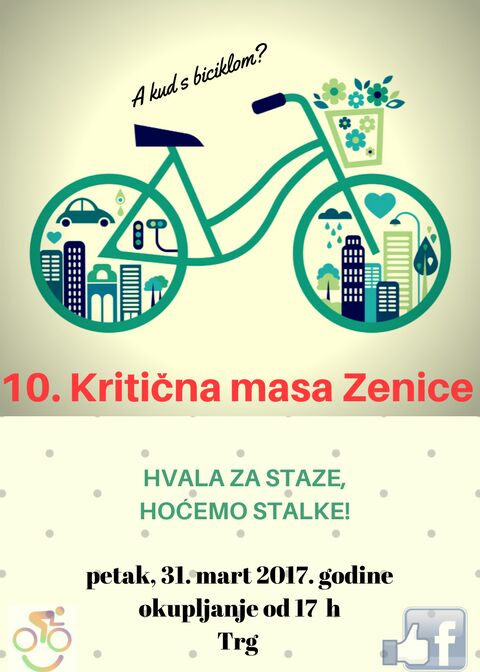 Deseta Kritična masa Zenice – Hvala za staze, hoćemo stalke! 31.03. u 17 sati – Mala jubilarna 10. kritična masa Zenice održat će se 31.03.2017. godine i ovaj put okupljanjem na Trgu od 17 sati. Ovog mjeseca, kritična masa će biti u znaku proljetnog protesta pod nazivom: Hvala za staze, hoćemo stalke!