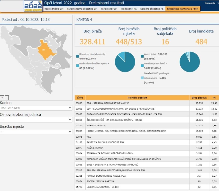 Nakon 87,33 posto prebrojanih glasova (448 biračkih mjesta) cenzus nisu prošli SBiH, Koalicija Država, BOSS, SPU BIH, PDA, SP i LS BIH. Nedostaju rezulati sa još 65 birališta, odnosno 12,67 posto glasova.