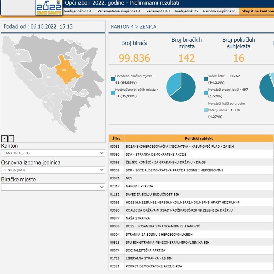 Zenicablog donosi najnovije ažuriranje podataka od strane Centralne izborne komisije Bosne i Hercegovine, sa podacima za Zeničko-dobojski kanton. Podaci su ažurirani u četvrtak poslijepodne.