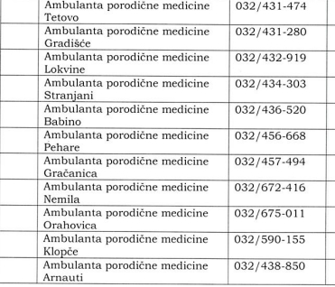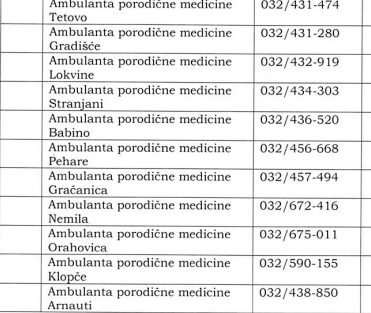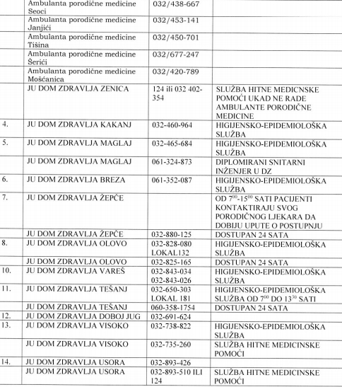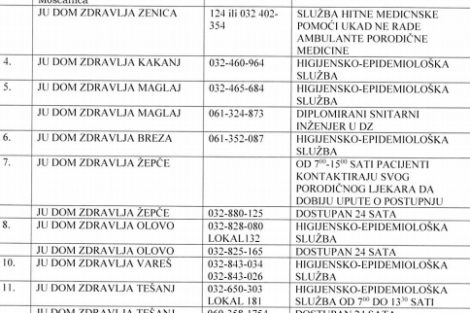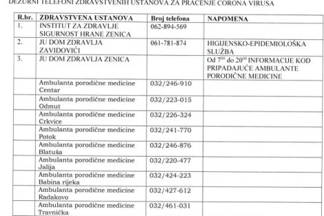 Dežurni telefoni zdravstvenih ustanova za praćenje Corona virusa u ZDK – Dostavljamo vam spisak dežurnih telefona zdravstvenih ustanova za praćenje Corona virusa u Zeničko-dobojskom kantonu: