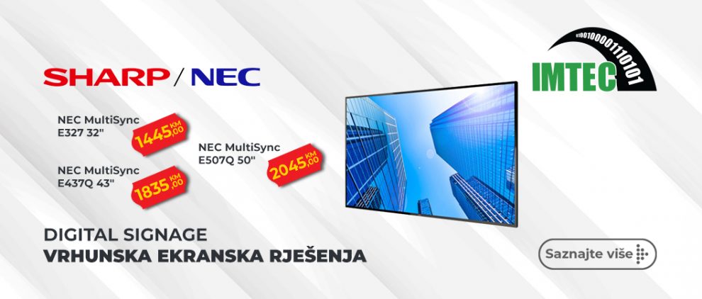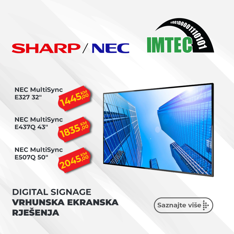 DIGITAL SIGNAGE: VRHUNSKA SHARP / NEC RJEŠENJA- Digital signage – ekransko rješenje je sve više rasprostranjeno u javnim prostorima i zajedničkim prostorijama kompanija, jer su digitalne reklame medij kojim se komunicira s različitom publikom, publikom koja je najčešće u pokretu. Upečatljiv sadržaj privlači pažnju prolaznika porukama osmišljenima tako da se one ističu u odnosu na druge.