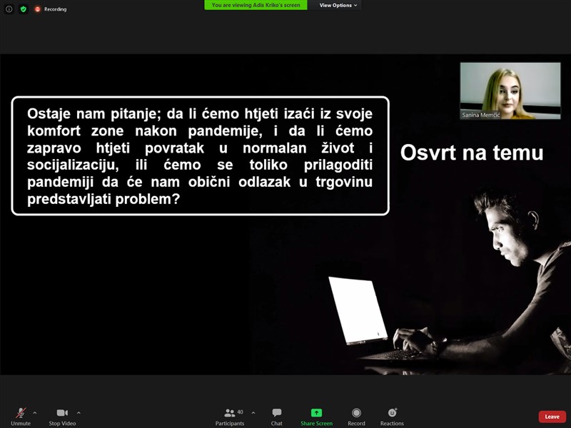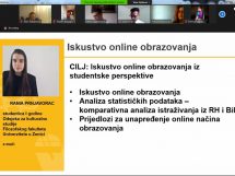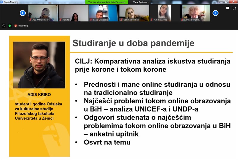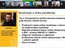 Između dvije tematske cjeline konferencije, studentica IV godine Emina Bajtarević, izvela je svoju autorsku pjesmu „Tu sam“, nakon čega je uslijedio drugi dio programa prvog konferencijskog dana. U okviru teme „Studiranje u doba pandemije“ prvo izlaganje držao je student I godine Adis Kriko koji je predstavio komparativnu analizu iskustava studiranja prije i tokom pandemije. Analiza je kroz rezultate anketnog upitnika predstavila i najčešće probleme sa kojima se studenti u BiH susreću u online modelu obrazovanja. Studentica Ranija Prnjavorac također je ukazala na iskustva sa online obrazovanjem, važnost fizičke interakcije, te specifične probleme u online nastavnom procesu poput dekoncentracije i distrakcije tokom nastave. U posljednjem izlaganju prvog dana konferencije, studentica Sanina Memčić u svom izlaganju „Ima li života nakon korone?“, detaljno je predstavila rezultate anketnog upitnika na temu studiranja u periodu pandemije, te načinila svojevrsnu projekciju stanja u budućnosti sa aspekta online obrazovanja.