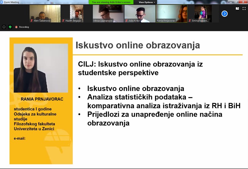 U organizaciji Odsjeka za kulturalne studije Filozofskog fakulteta Univerziteta u Zenici, u utorak, 27. aprila otvorena je prva bh. studentska konferencija iz oblasti kulturanih studija. Ovaj dvodnevni skup pod nazivom „Kultura u vrijeme distance“ održan je u online formatu, a pored većeg broja studenata učešće u njemu uzeli su i univerzitetski profesori, novinari i drugi zainteresirani kulturni djelatnici.