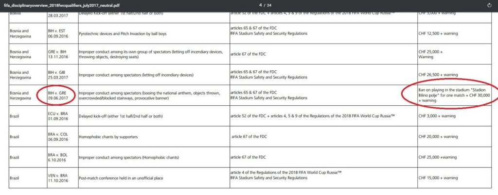 Disciplinska komisija: FIFA kaznila Džeku, Bešića i Gillija, suspendovano i Bilino polje! – Disciplinska komisija Svjetske fudbalske federacije izrekla je danas kazne za incidente koji su se dogodili nakon utakmice kvalifikacija za Mundijal u Rusiji između BiH i Grčke odigrane 9. juna na Bilinom polju.