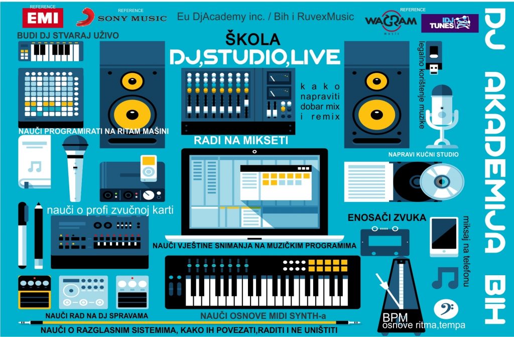 Počinjemo sa teoretskim pedavanjima,završavamo sa live nastupom polaznika, predznanje potrebno u obliku osnova poznavanja rada na računaru. Sva oprema koja će se koristiti u radu i predavanjima je vrhunska oprema.