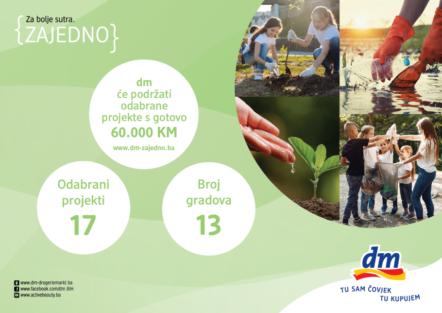 U okviru društveno odgovorne inicijative {ZAJEDNO} za bolje sutra – eco edition dm drogerie markt podržat će realizaciju ekoloških projekata koji direktno doprinose zaštiti i očuvanju okoliša s gotovo 60.000 KM ukupne vrijednosti.