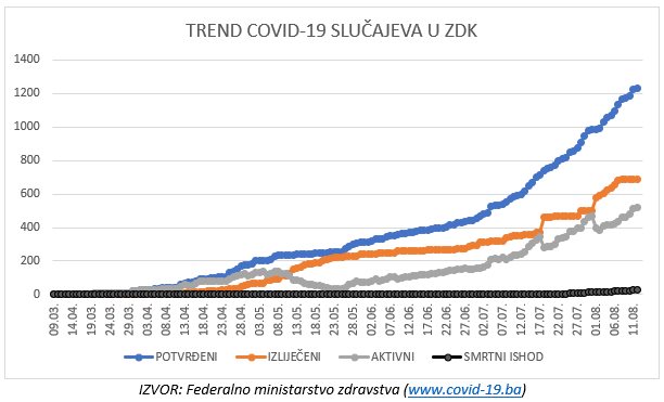 NAPOMENA: Ukupni broj novih slučajeva je zbir od 10.08. (3), 11.08. (21) i 12.08. (8). Kumulativni broj COVID-19 pozitivnih umanjen za jedan (grad Zenica).