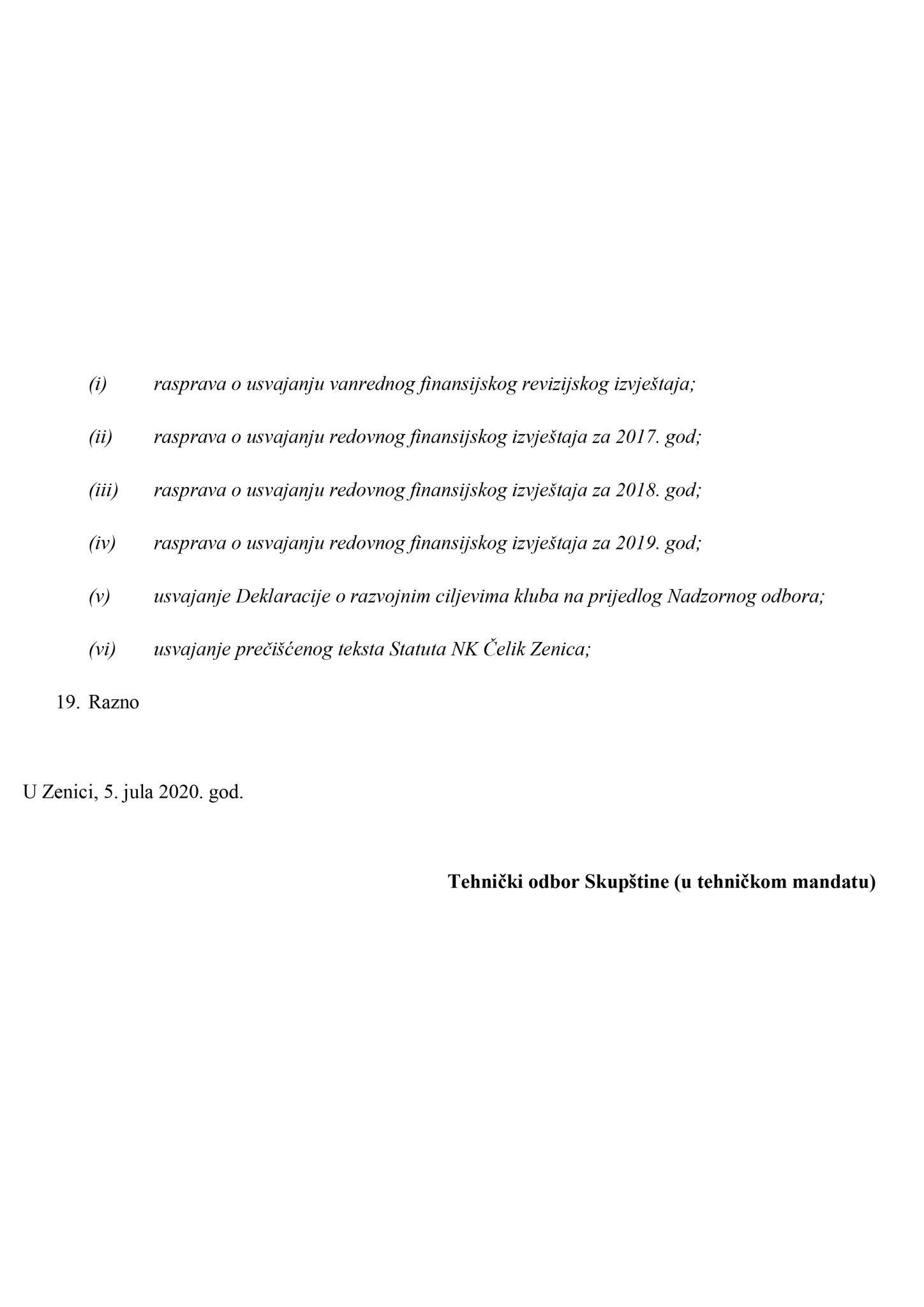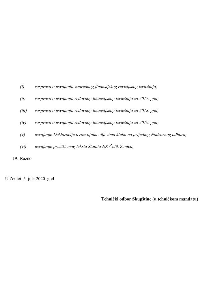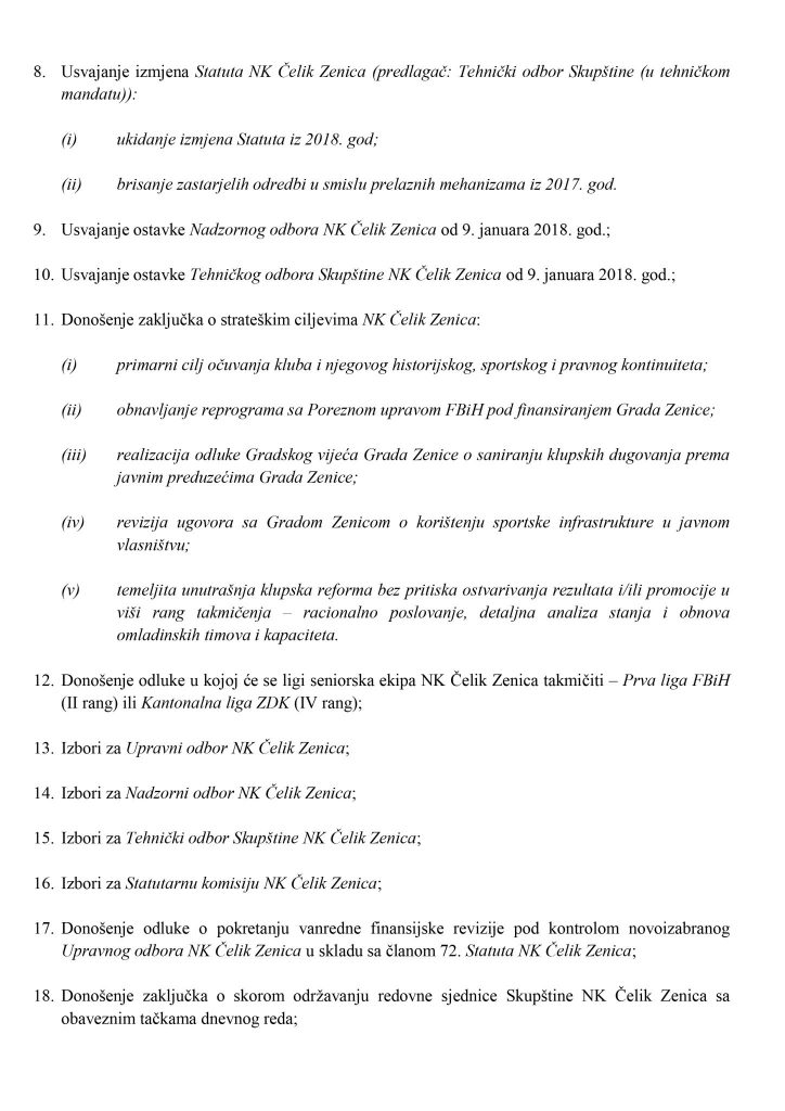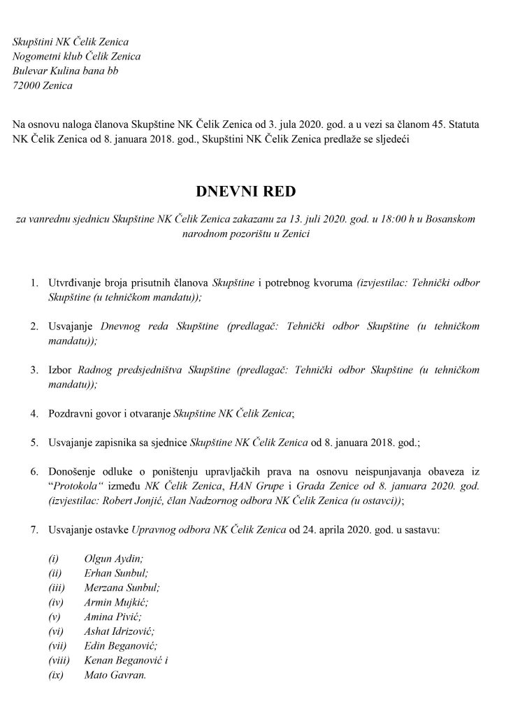 Dnevni red – Skupština NK Čelik Zenica – Nogometni klub Čelik iz Zenice obavještava članove kluba da je, shodno nalogu članova koji su dostavili zahtjev za održavanje vanredne sjednice Skupštine, Tehnički odbor Skupštine (u tehničkom mandatu) predložio dnevni red za održavanje sjednice.