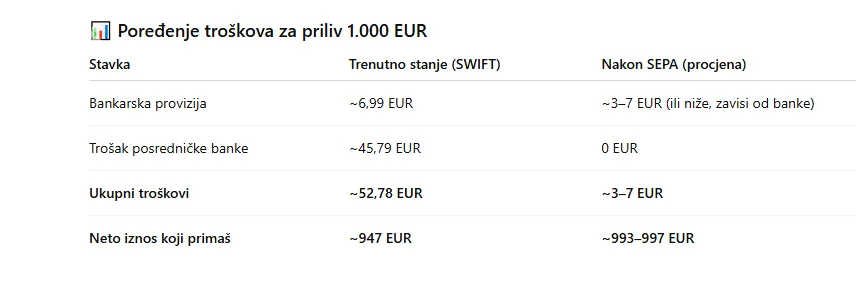 S druge strane, kada BiH postane punopravna članica SEPA-e trošak na 1.000 uplaćenih eura će iznositi oko 7 eura na bankarsku proviziju, dok se u potpunosti ukidaju troškovi posredničke banke od 45,8 eura, tako da ćete u konačnici primiti oko 993 eura.