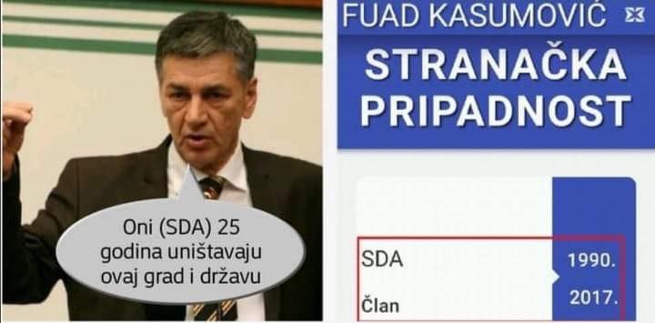 Iako se svojevremeno hvalio da ima jednu od prvih članskih karata SDA, gradonačelnik Fuad Kasumović često voli reći da NIKADA nije bio član te stranke. Isto ovo ponavlja iz predizbornog skupa u predizborni skup tokom ovogodišnje kampanje za Lokalne izbore u Zenici.