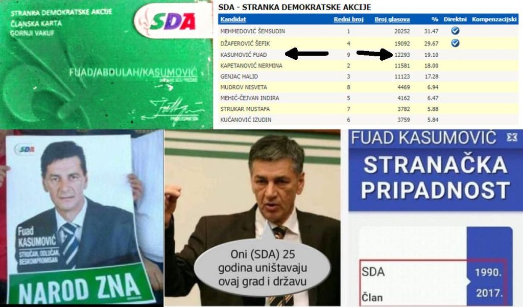 Međutim, čitaoci su nam ukazali na još jednu nedosljednost aktuelnog kandidata BHI KF, stranke, koja nosi ime po njemu. Naime, Fuad Kasumović je na općim izborima ne tako davne 2010. bio na listi, predizbornim plakatima i u kampanji SDA kao kandidat i zamalo mu je izmakla klupa u državnom Parlamentu BIH, kao članu te stranke.