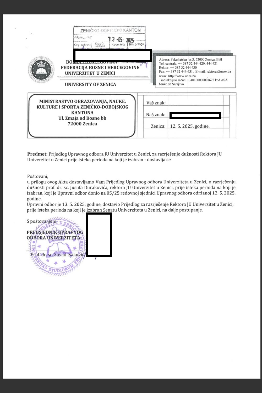 Zenicablog je sinoć (nedjelja) ekskluzivno objavio informaciju o zahtjevu Upravnog odbora Univerziteta Zenica koji od Senata ove visokoškolske ustanove traži da razriješi aktuelnog rektora Jusufa Durakovića.