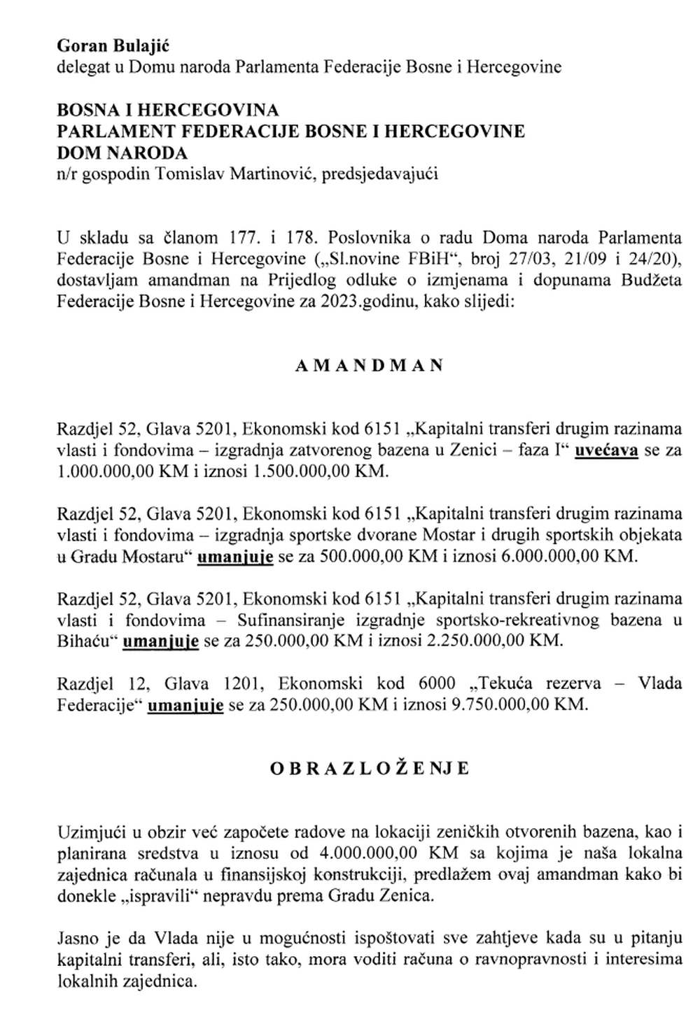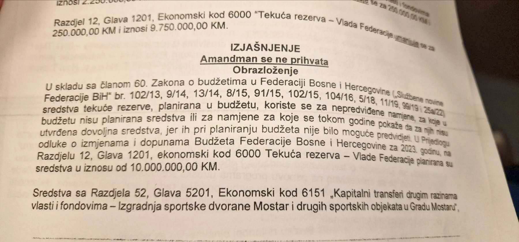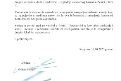 Jedan od amandmana bio je Zeničanina Gorana Bulajića (Demokratska fronta) u kojoj je traženo da se barem osigura 1, 5 miliona (40 posto ranije predviđenih sredstava), i to preraspodjelom nekoliko stavki. Nažalost, Vlada je odbila taj amandman prilično smiješnim obrazloženjem (pogledajte ispod), a potom je i amandman preglasan, odnosno Rebalans je usvojen bez prihvatanja ovog i sličnih amandmana.
