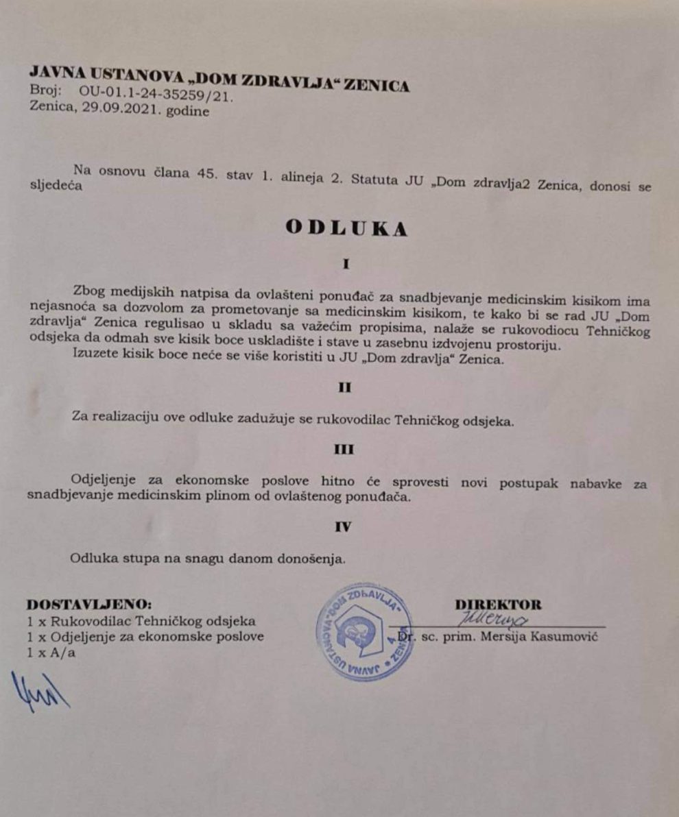 Istog dana je od firme “Istrabenz plini” d.o.o. Breza zatraženo da dostave certifikat o kvaliteti medicinskog kisika, koji je dostavljen, ali je bez obzira na to, iz preventivnih razloga, donesena i Odluka o povlačenju i uskladištenju medicinskih kisik boca u zasebnu prostoriju, što potkrijepljuje akt od 29. septembra u prilogu.