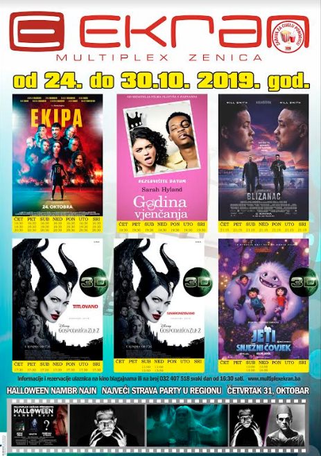 Nakon deset godina rada i preko 15 hiljada filmskih projekcija, pred nama je posljednja filmska sedmica u Multiplexu „Ekran“ Zenica. Publika će u posljednjoj sedmici imati priliku da uživa u itekako bogatom filmskom programu. Naime, sa prikazivanjem počinje nova srbijanska hit komedija „Ekipa“, u kojoj glavne uloge ostvaruju Andrija Milošević, Rade Ćosić, Sergej Trifunović, Dragan Jovanović, Srđan Todorović, Ljubomir Bandović, Ljiljana Stjepanović, Ivana Dudić i Anđela Jovanović, što je svakako razlog više da posjetimo kino. Osim navedene komedije, na programu je i romantična komedija „Godina vjenčanja“ koja će nas upoznati sa Marom, bezbrižnom djevojkom koja ima želju da postane fotograf. Na Tinderu upoznaje momka po imenu Jake te s njim razvije neočekivanu vezu. Na programu je i film „Gospodarica zla 2“, kao i akcijski hit „Blizanci sa Will Smithom u glavnoj ulozi.