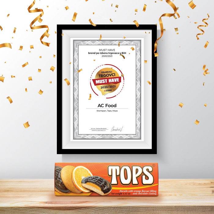Domaći megabrend dobitnik “Must have” priznanja: Top nagrada za TOPS kvalitet!- Najomiljeniji domaći biskvit i jedan od najprodavanijih u svojoj kategoriji u regiji – Tops po treći put je dobitnik “Must have” priznanja koje dodjeljuje magazin IN Store u saradnji sa najvećim trgovačkim lancima u Bosni i Hercegovini i oko 7.000 trgovaca.