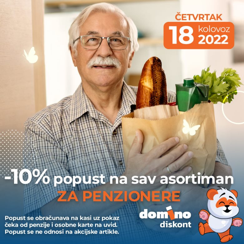Domino diskont – AKCIJA -10% ZA PENZIONERE – I ovog četvrtka, samo za naše drage penzionere, pripremili smo popust od čak -10% na cjelokupan asortiman.