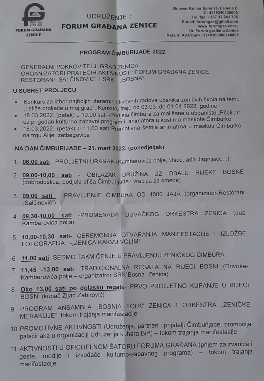 -Ovo je 14. međunarodna Eko regata Bosna ratfing „Proljeće 2022“ u organizaciji SRK Bosna, koja će prema najavama okupiti preko stotinu učesnika iz naše zemlje i regiona i trebala bi startovati na rijeci Bosni u 11,45 od Drivuše-ribarska staza, pa do centralmog dijela Kamberovića polja. Za ovu regatu imamo najavu više klubova iz zemlje i regiona kao i klubova iz Zenice. Ovo je jedan od sadržaja Čimburijade, koji je veoma popularan i uklapa se u sportski dio manifestacije i ujedno je iskristalisan kao jedan od redovnih sadržaja na Čimburijadi, – kazao je, pored ostalog, Ekrem Tuka, predsjednik SRK Bosna Zenica.