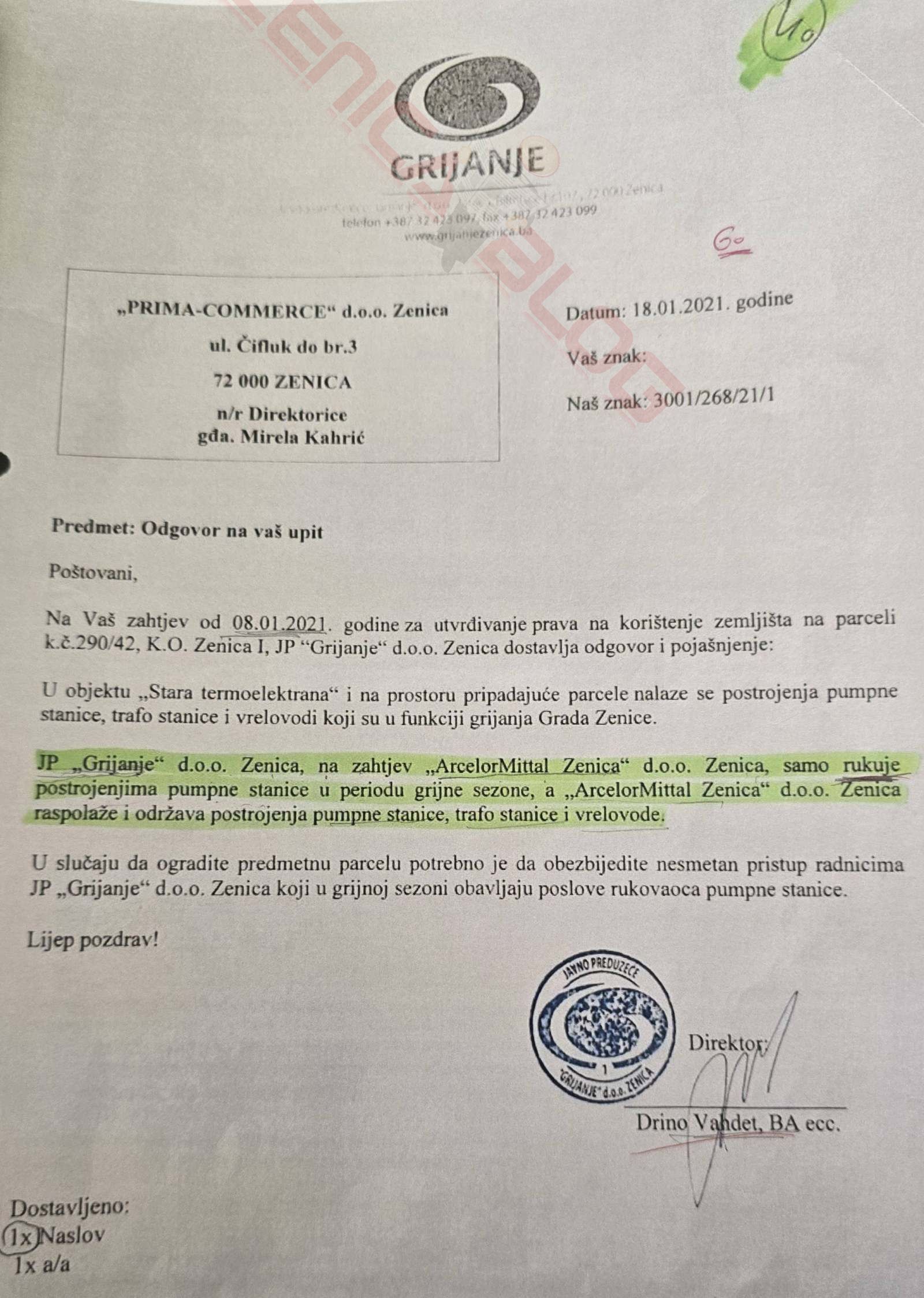 A šta se ustvari dogodilo? Kupac parcele, suočen s činjenicom da kroz parcelu prolazi vod važan za grijanje Grada Zenica predlaže da, pazite sad, BESPLATNO ustupi dva duluma na desnom kraju parcele, kao i da pomogne Gradu i JP “Grijanje” da se vod izmjesti iz centra parcele, što bi “Prima komercu” omogućilo konačno privođenje parcele namjeni i početku investicija. Grad i “Grijanje” to odbijaju, pa čak iako im je potrebno samo dva (2) od 26, 7 duluma insistiraju da se kupoprodajni ugovor poništi, da oni “preuzmu” cijelu parcelu…