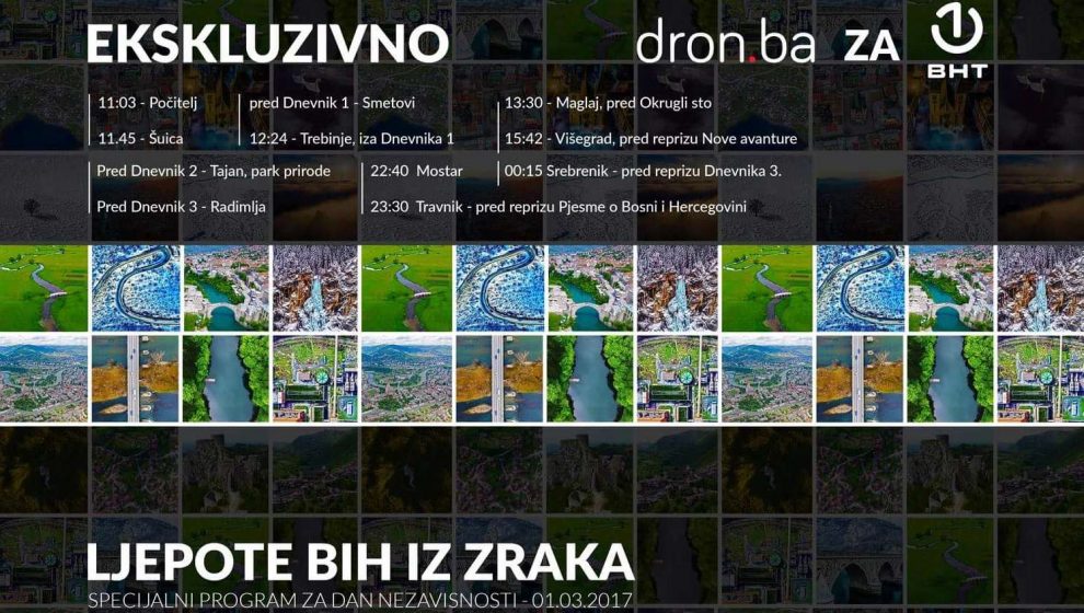 Dron.ba za BHT: Ljepote BIH iz zraka – Zenički multimedijalni tim Dron.ba čije radove, osim na oficijelnoj web prezentaciji, možete pratiti i na Zenicablogu, pripremio je specijalni namjenski program za državnu TV, BHT. Kako su nam potvrdili iz Dron.ba, pripremljen je specijalni kolažni program sa desetak lokacija iz cijele BiH.