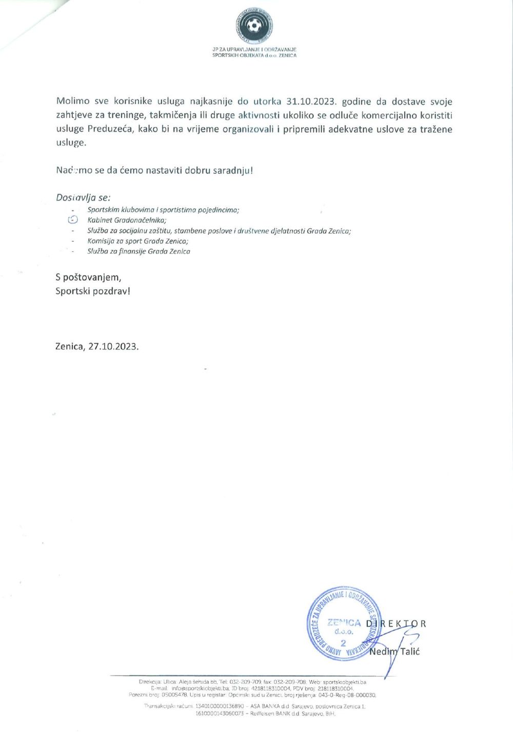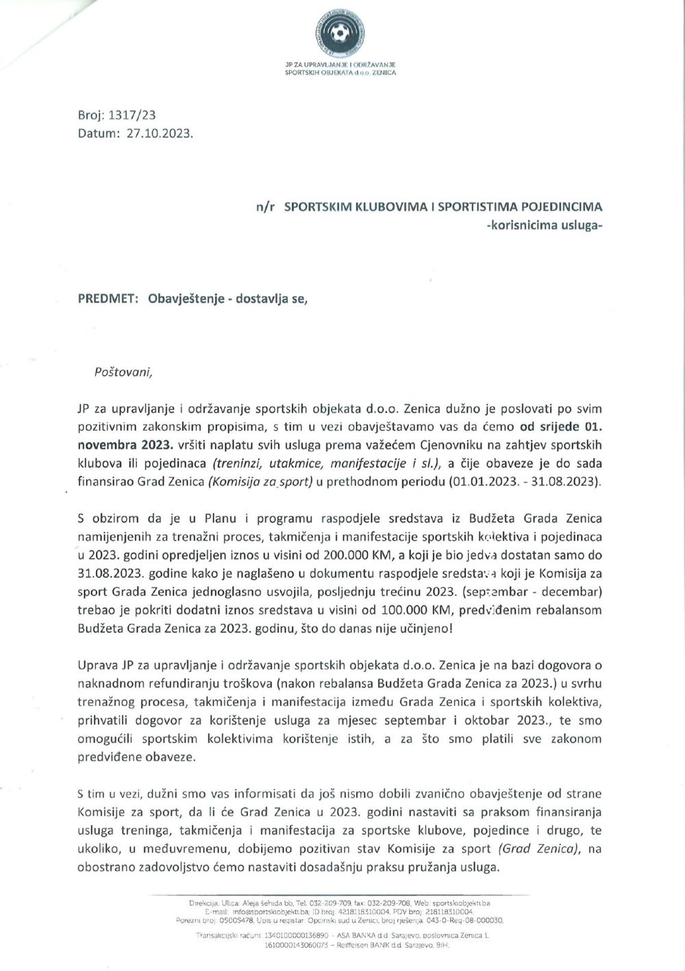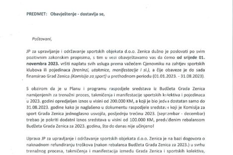 -JP za upravljanje i održavanje sportskih objekata d.o.o, Zenica dužno je poslovati po svim pozitivnim zakonskim propisima, s tlm u vezi obavještavamo vas da ćemo od srijede 01. novembra 2023. vršiti naplatu svih usluga prema važećem Cjenovniku na zahtjev sportskih klubova ili pojedinaca (treninzi, utakmice I sl,), a čije obaveze je do sada financirao Grad Zenica (Komisija za sport) u prethodnom periodu. (01.01.2023. – 31.08.2023).