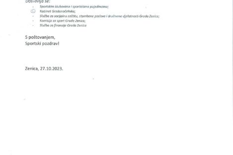 S tim u vezi, dužni smo vas informisati da još nismo dobili zvanično obavještenje od strane Komisije za sport, da li će Grad Zenica u 2023. godini nastaviti sa praksom finansiranja usluga treninga, takmičenja i manifestacija za sportske klubove, pojedince i drugo, te ukoliko, u međuvremenu, dobijemo pozitivan stav Komisije za sport (Grad Zenica), na obostrano zadovoljstvo ćemo nastaviti dosadašnju praksu pružanja usluga.