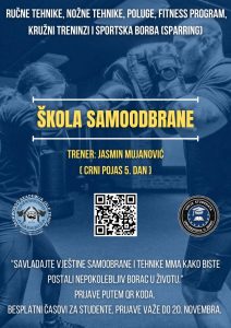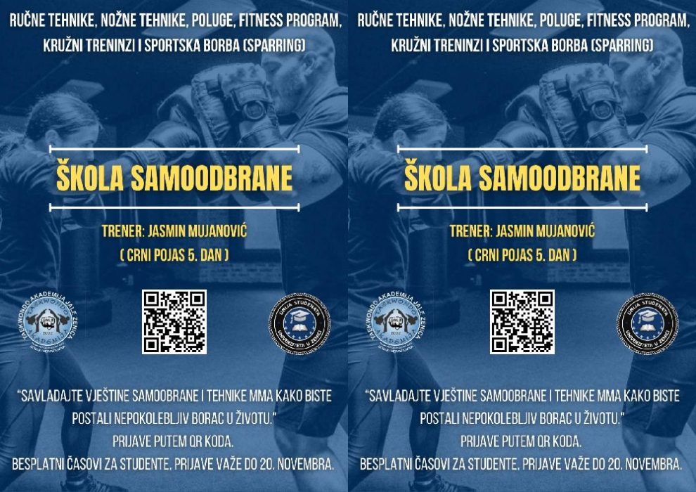 Taekwondo Akademija Jale u saradnji sa unijom studenata sa UNZE, organizuje drugi upisni rok za upis u školu somodbrane koji traje do 20.11.2023.godine.