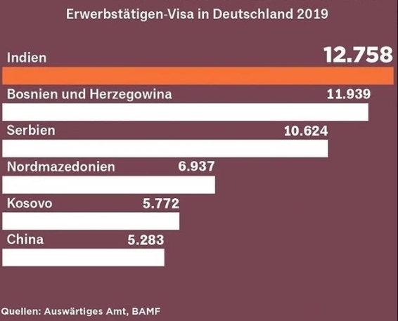 Državljanima Indije je 2019. u Njemačkoj odobreno ukupno 12.758 radnih viza. Bosancima i Hercegovcima odobreno je ukupno 11.939 radnih viza, što ih stavlja na drugo mjesto. Na trećem mjestu su državljani Srbije sa odobrenih 10.624 radnih viza.