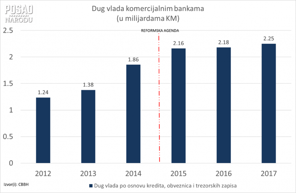 Na slici 1. dat je šestogodišnji pregled zaduživanja vlada u BiH (prije svega vlada FBiH i RS) kod komercijalnih banaka, gdje je vidljivo da je vrijednost toga duga u 2017. bila dvije milijarde i dvije stotine pedest miliona KM, uz rapidan rast u posljednje tri godine u vrijednosti od 390 miliona KM ili 21% (!).