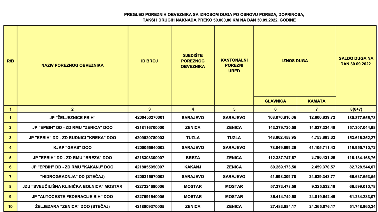 Prema ovim podacima, dug prvih deset firmi premašio milijardu KM, a najveći dužnik i dalje je je preduzeće “Željeznice FBiH”, čiji je dug 30. septembra iznosio 180.877.655 KM.