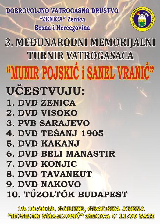 Dobrovoljno vatrogasno društvo “Zenica“ Zenica organizuje već tradicionalni 3. Međunarodni memorijalni turnir prijateljstva vatrogasaca u malom nogometu “Munir Pojskić i Sanel Vranić“, a učesnici su: