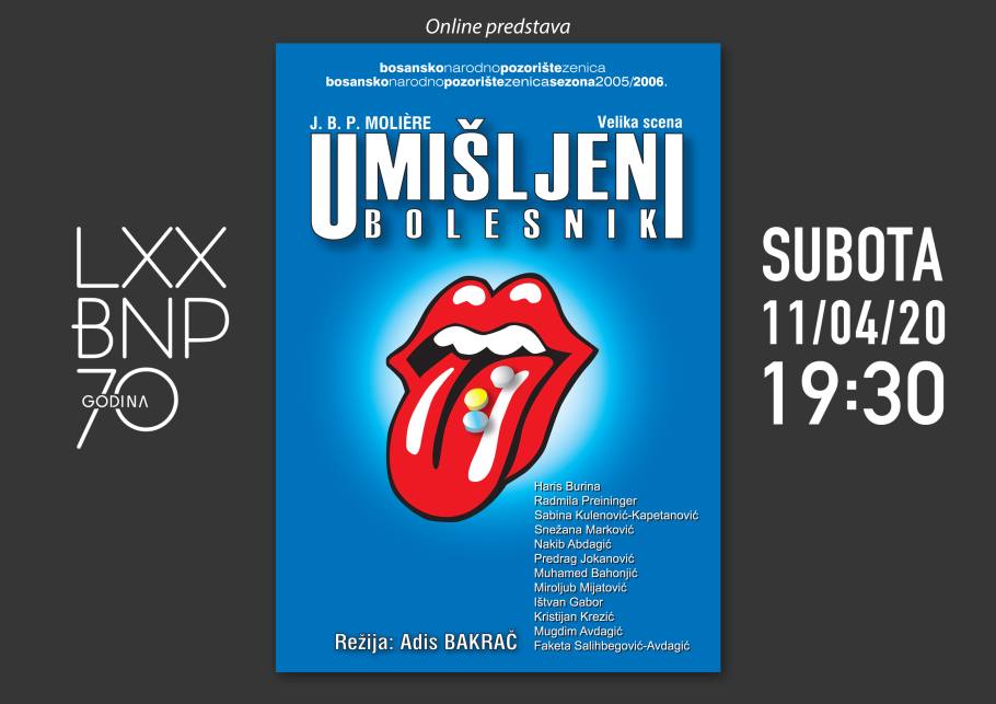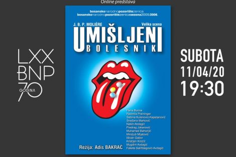 Isti dan od 19.30 sati će putem Youtube kanala BNP Zenica biti dostupna predstava „Umišljeni bolesnik“ nastala prema tekstu Jean-Batiste Poquelina Moliera, u režiji Adisa Bakrača i u produkciji Bosanskog narodnog pozorišta Zenica. Premijerna izvedba predstave je odigrana 22. decembra 2005. godine. U predstavi igraju: Haris Burina, Radmila Preininger, Sabina Kulenović, Snežana Vidović, Nakib Abdagić, Predrag Jokanović, Muhamed Bahonjić, Miroljub Mijatović, Ištvan Gabor, Kristijan Krezić, Mugdim Avdagić i Faketa Salihbegović-Avdagić.