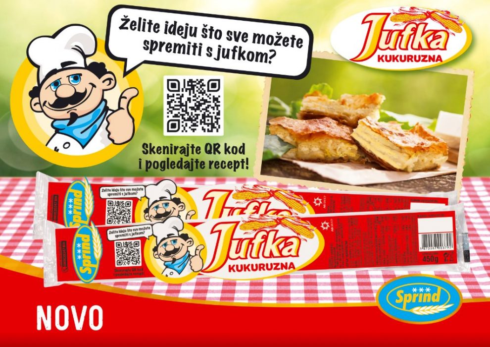 Prva kukurzna jufka i QR kod sa receptima – Sarajevska prehrambena industrija Sprind plasirala je na tržište novu kukuruznu jufku 450g. Riječ je o svojevrsnoj inovaciji i prvom proizvodu te vrste na tržištu Bosne i Hercegovine. Osim novog proizvoda, u Sprindu su kreirali i novu ambalažu sa QR kodom preko kojeg je ova kompanija odlučila prenijeti najbolje recepte iz bogate tradicije bosanske kuhinje na mlađe generacije, saopćeno je iz Sprinda.