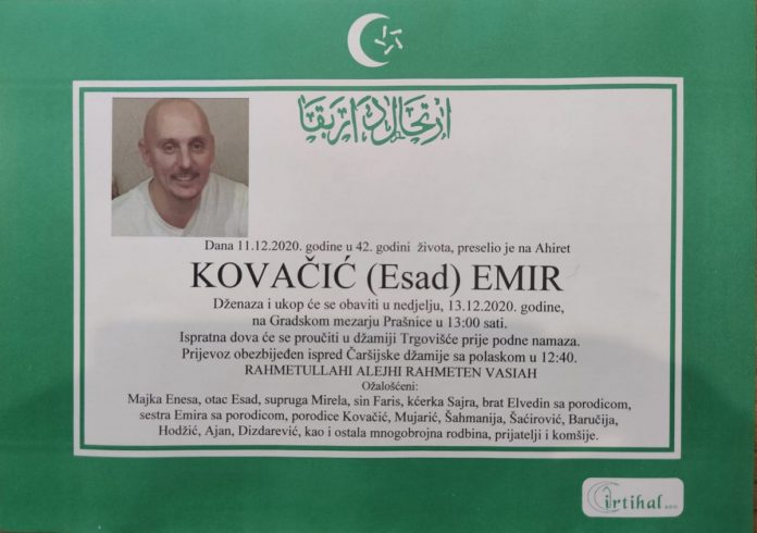 U nedjelju, 13. decembra u 13 sati, obavit će se dženaza našem sugrađaninu Emiru Kovačiću na Gradskom mezarju Prašnice u Zenici. Ispratna dova će se proučiti u džamiji Trgovišće prije podne namaza.