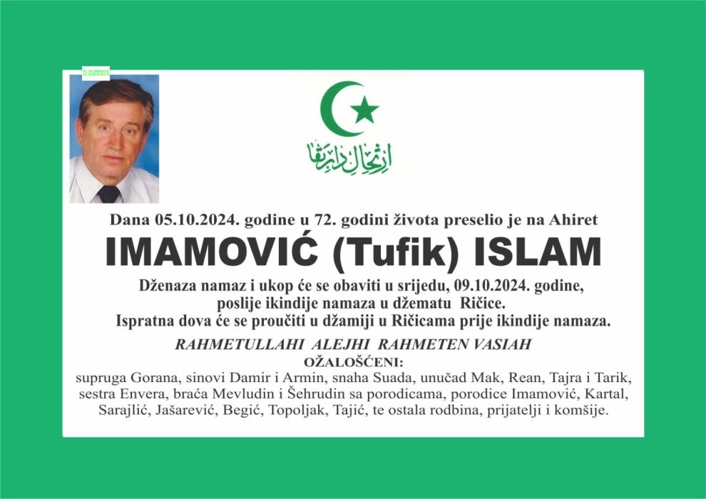 Dženaza će se klanjati, a ukop obaviti poslije ikindija namaza, a ispratna dova će se proučiti prije ikindije, u džamiji u Ričicama.