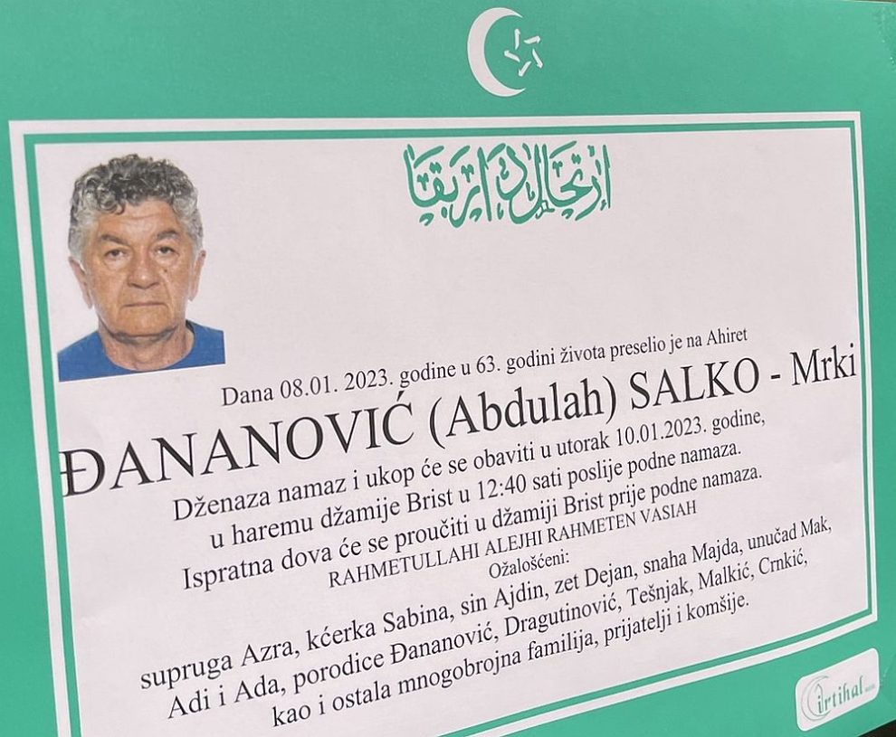 Dženaza namaz Salki (Abdulaha) Džananoviću i ukop obaviće se sutra (utorak) 10. januara, u haremu džamije Brist, u 12.40 sati, poslije Podne namaza, gdje će se prije Podne namaza proučiti i Ispratna dova.