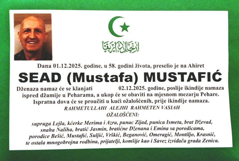 Dženaza namaz Seadu (Mustafi) Mustafiću, koji je preselio na Ahiret danas, 1. decembra 2025. godine u 58. godini života, bit će klanjana u utorak, 2. decembra 2025. godine, poslije ikindije namaza ispred džamije u Peharama.