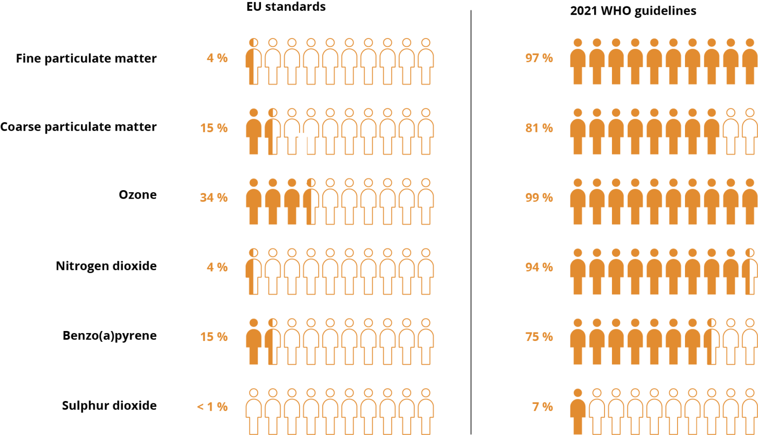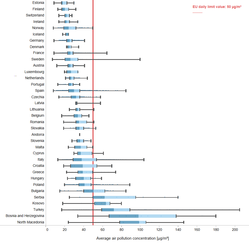 Svjetska zdravstvena organizacija 2021. godine usvojila je nove smjernice za kvalitet zraka, koje su pooštrile granične vrijednosti čak i u odnosu na stroga EU pravila. Po novim smjernicama, čak 97% urbane populacije u EU izloženo je prekomjernim koncentracijama fine prašine PM2.5 (čestice prašine sitnije od 2,5 mikrometra, koje smanjuju funkciju pluća, izazivaju hronični bronhitis, ulaze u krvotok i dovode do kardiovaskularnih oboljenja i prerane smrti).